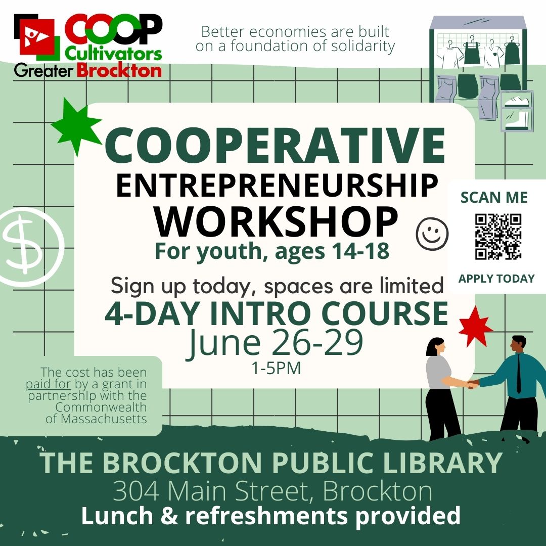 The 2023 Cooperative Entrepreneurship Workshop for Youth. Social media and flyer graphics created. Total event attendees: 15. QR code included for a Google registration form.